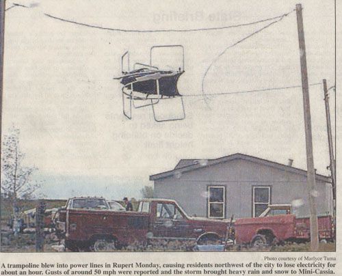 From the front page of The southern Idaho Press May 12th 2005. Photo by Marlyce Tuma Submited by Jason Rollins Definately not your typical storm damage
