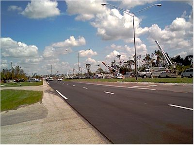 I work for Shaw Energy Delivery Services. These are pictures from the Hurricane Charlie in Port Charlotte, Fla. Mike Blevins and Lee Vickers on pole we set with the crane.