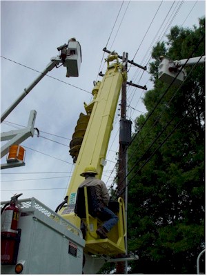 Murray Electric System in Murray, Kentucky had to repair lightning strike yesterday. Lineman in pictures: Dean Arnold / Buzz Paul-in one bucket. Frank Maupin in other bucket. Jason Burkeen operating the digger truck.